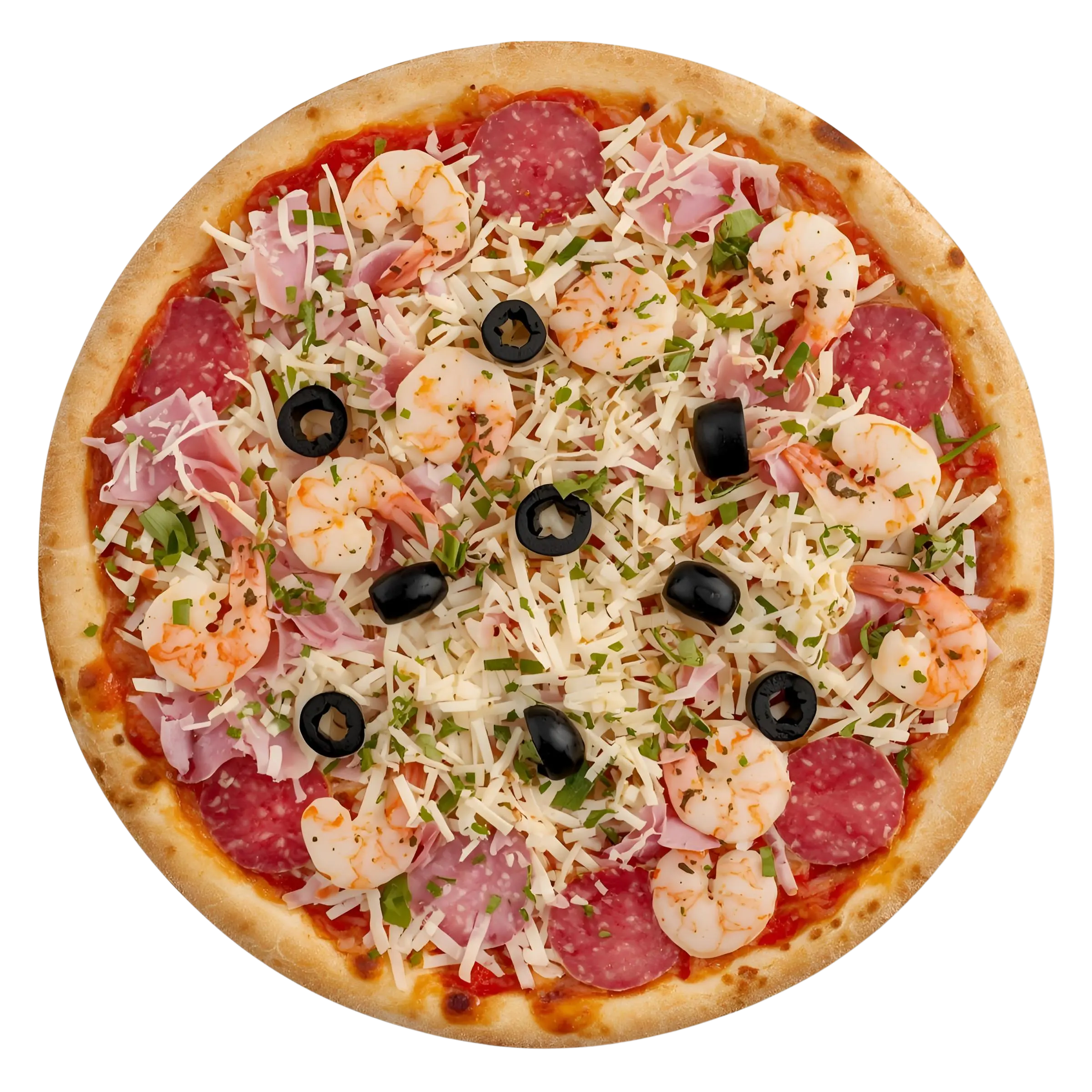 Tomato sauce, mozzarella, ham, prawns, hot salami, olives
