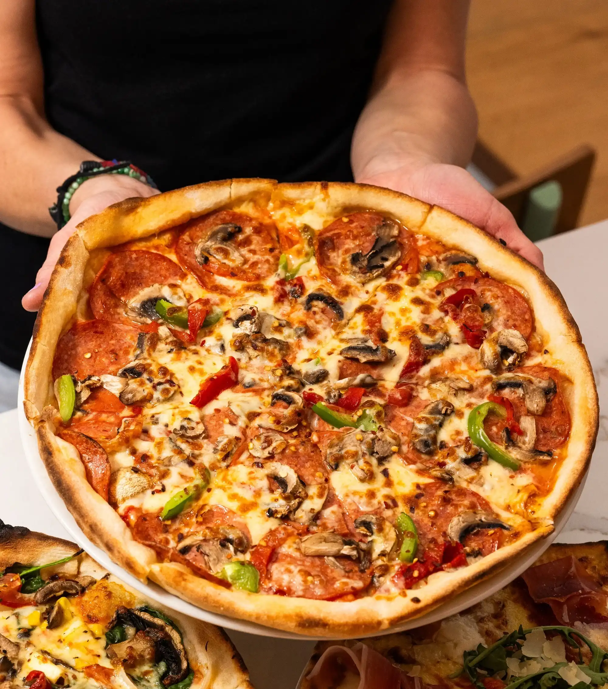 Tomato sauce, mozzarella cheese, hot salami, mushroom, capsicum and chilli flakes