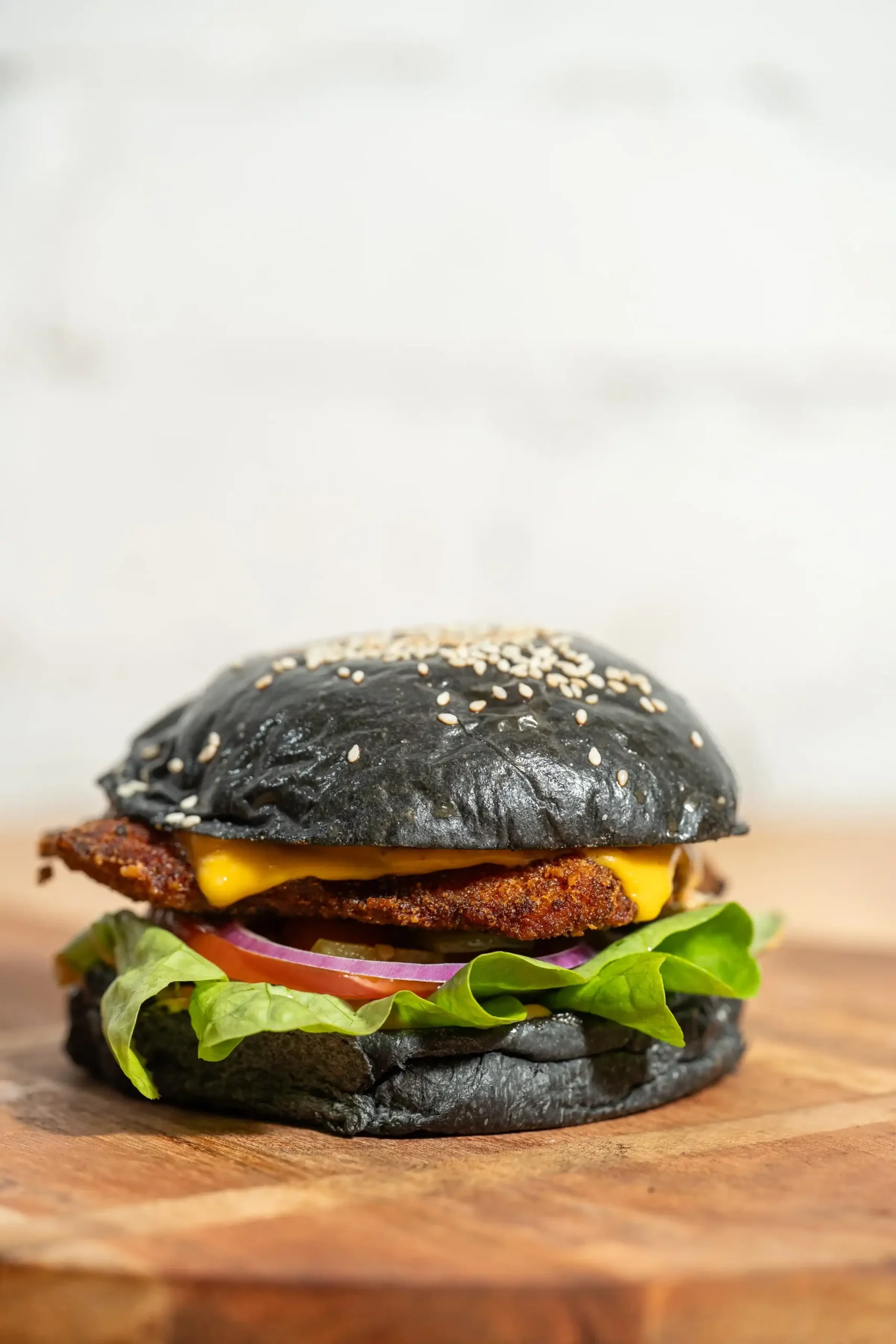Black bun, plant based patty, cheese, avocado, lettuce, tomato, onion, jalapenos, lulu’s sauce, chipotle mayo