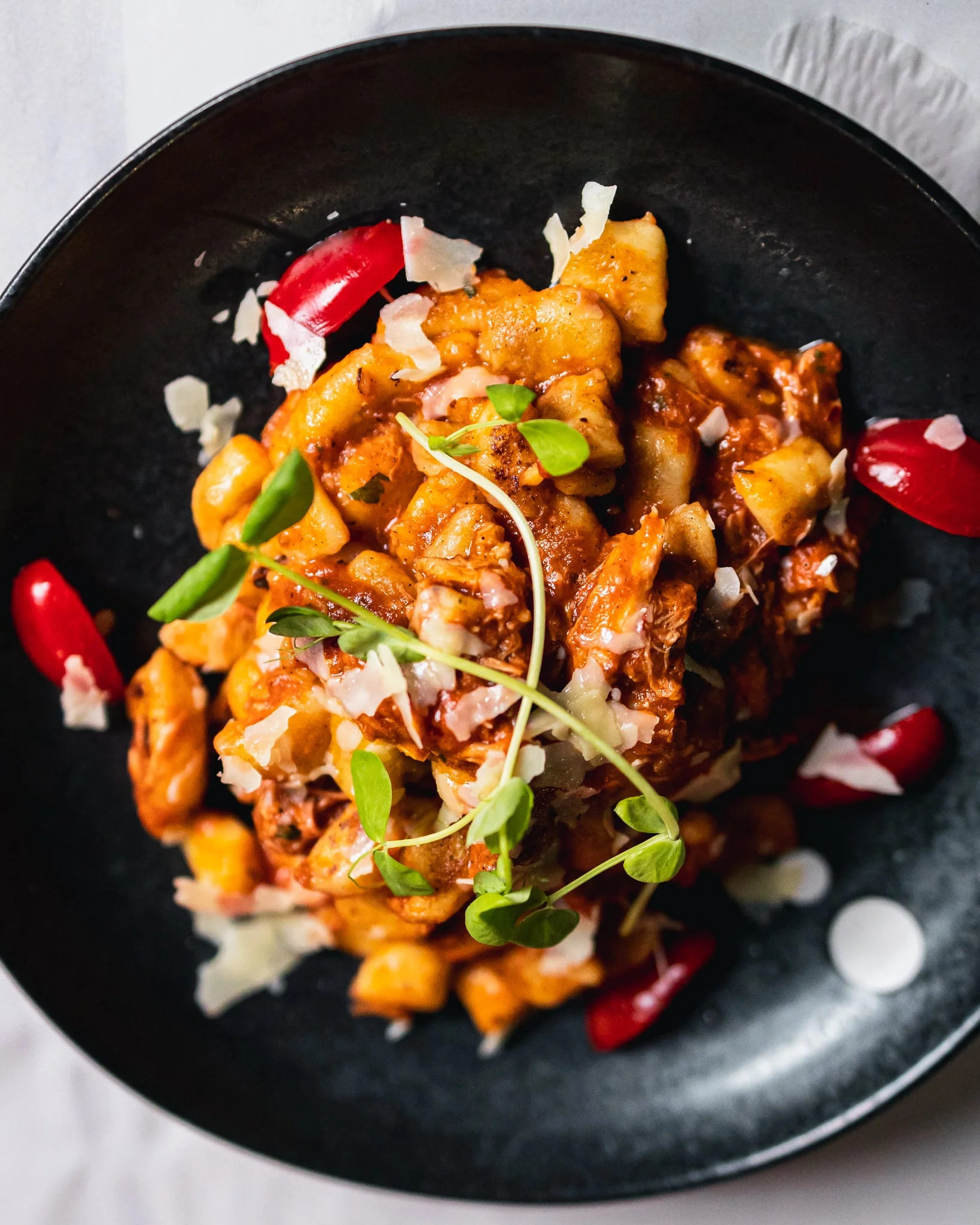 Potato stuffed gnocchi, spinach, pork mince, white creamy sauce