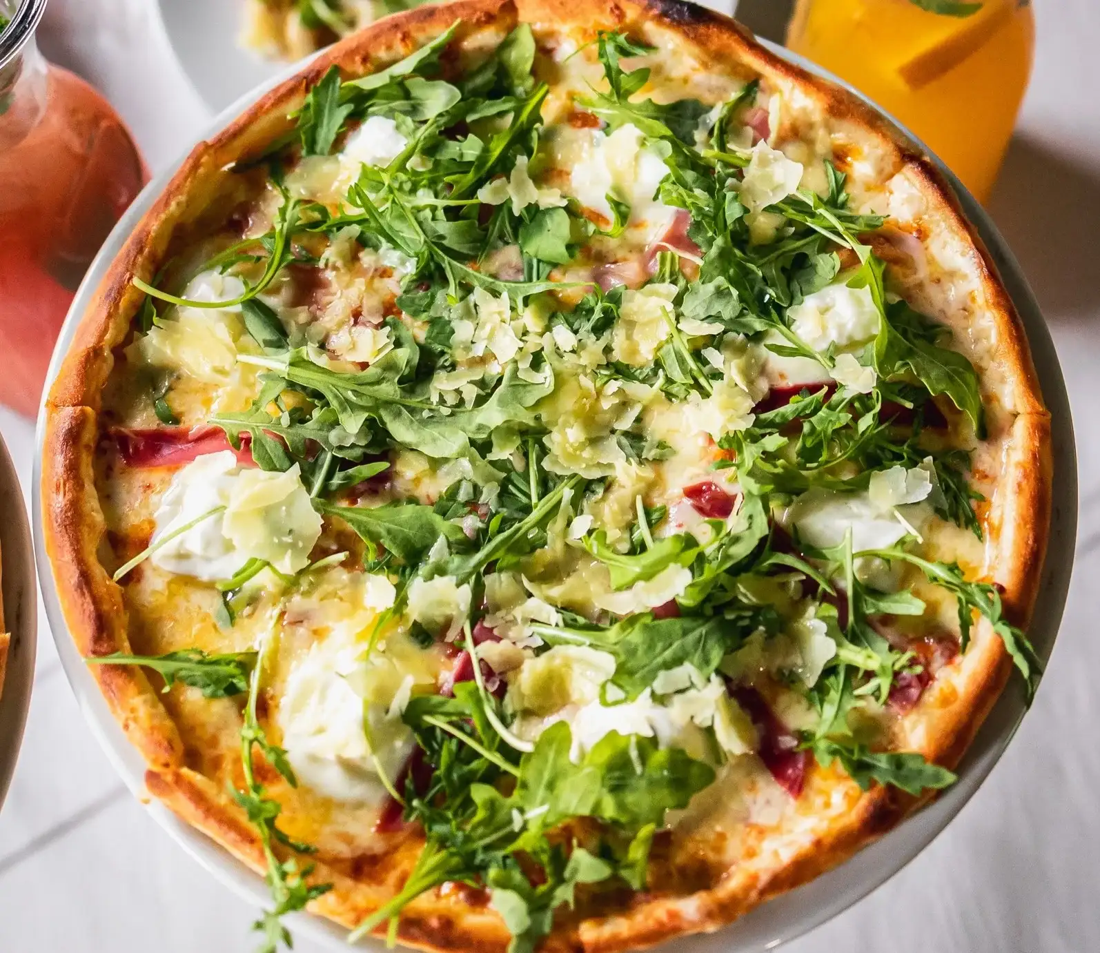 Tomato sauce, mozzarella cheese, buffalo cheese, crudo, rocket and parmesan