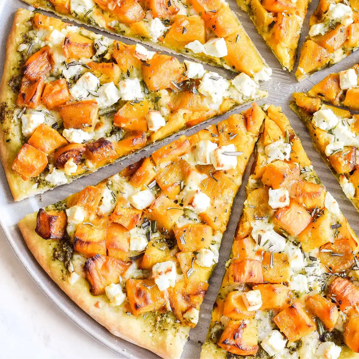 Tomato sauce, mozzarella cheese, spinach, onion, pumpkin, goat cheese