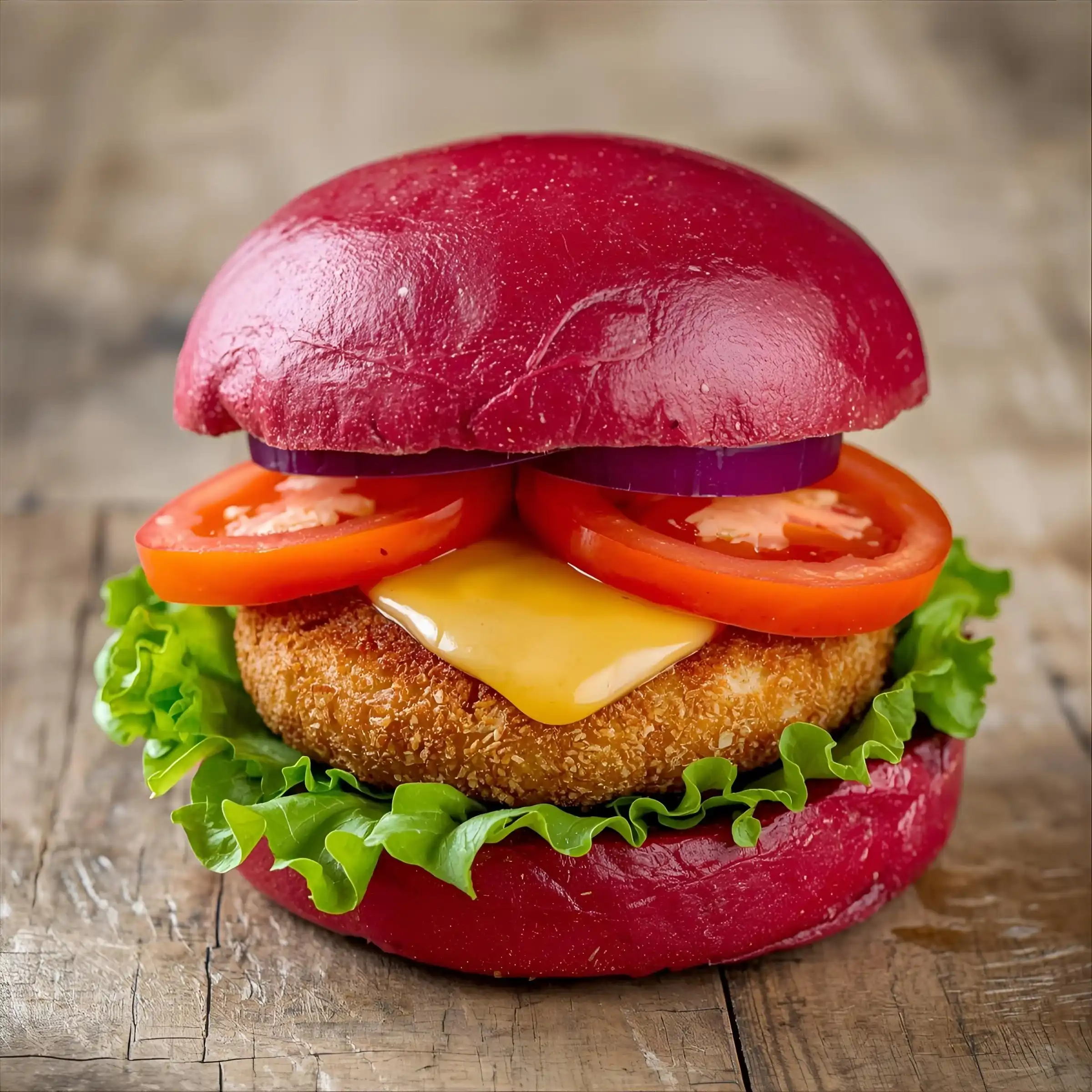 Beetroot bun, fried halloumi patty, cheese, avocado, beetroot relish, rocket, tomato, onion, mayo